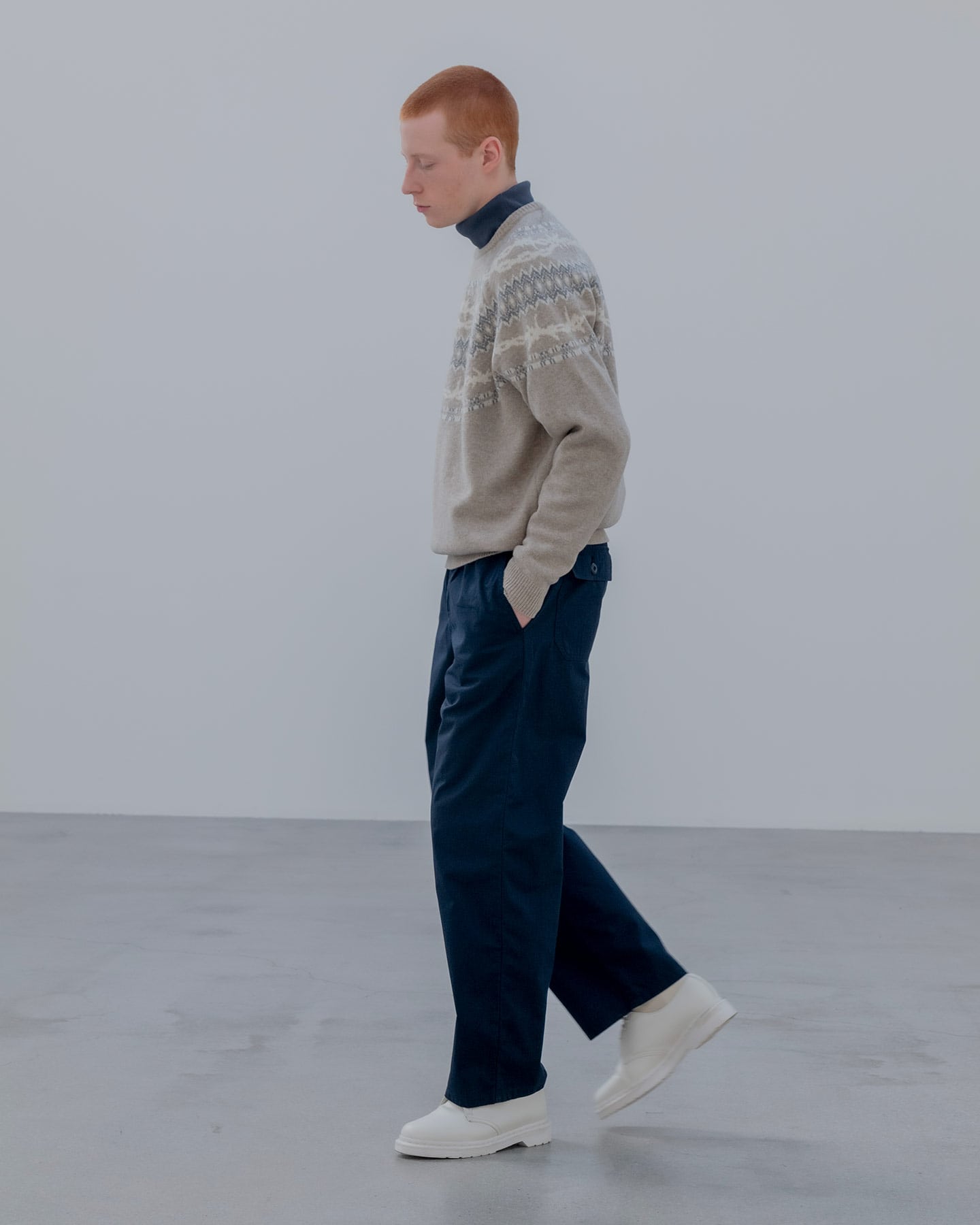 UEの冬のベーシックアイテムとして定着しているノルディック柄ニットに、今季は有刺鉄線柄をダイナミックにミックスしてパンクのエッセンスを注入。素材に用いたオーストラリア産のメリノウールは保温性の高さと蒸れにくさを兼ね備えているため、暖かい室内でもさらりとしたドライな着用感が持続します。