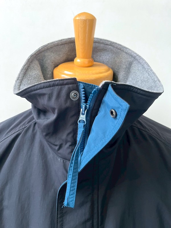 ナイロンタッサーを表地に、リサイクルポリエステル製のフリースを裏地に使用したラグランスリーブのナイロンジャケット。比翼仕立ての前立て、身頃の左右にハンドウォーマーを配し、左胸にCACHALOTの刺繍、襟の背面にHORIZONロゴのネーム付き。